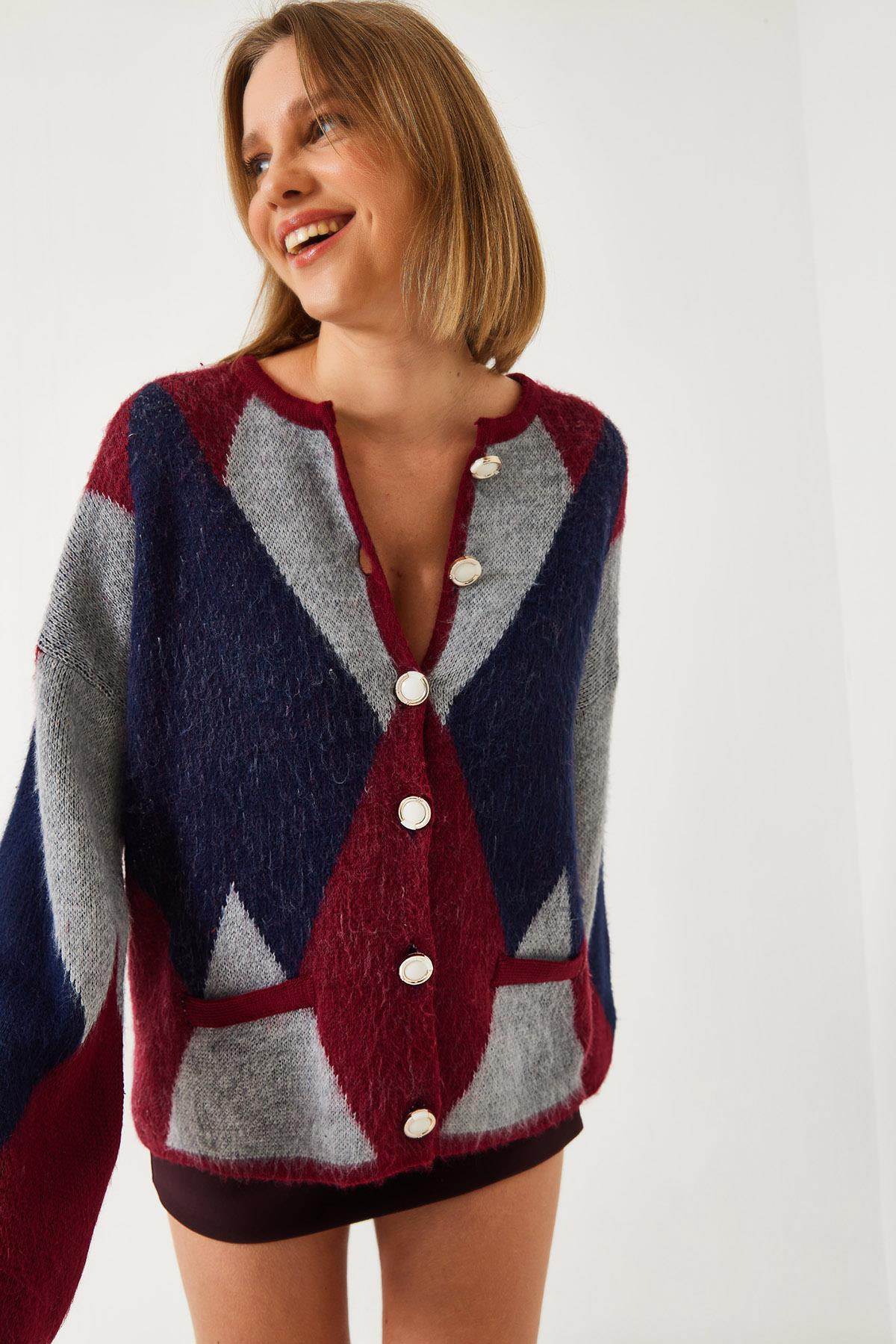 Baklava Desenli Oversize Triko Hırka 4021 60261248 - Bordo-Lacivert