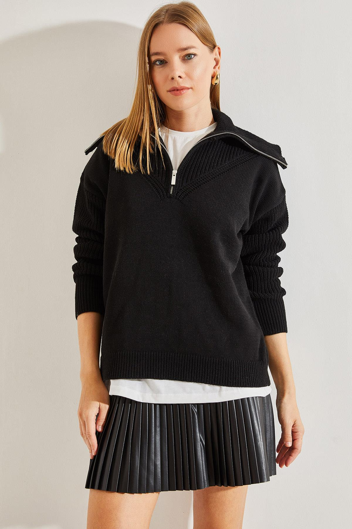 Balıkçı Yaka Fermuarlı Triko Kazak - Siyah KAZAK modelleri