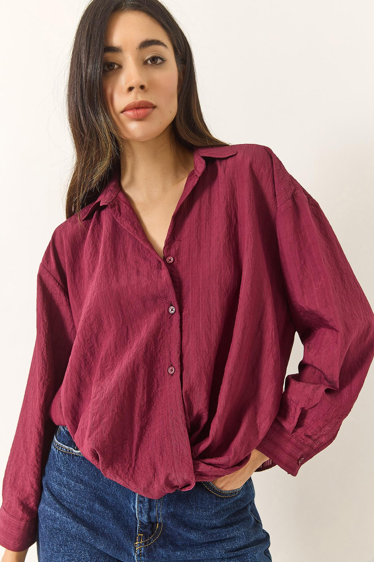 Büzgü Detaylı Jakarlı Çizgi Detaylı V Yaka Salaş Gömlek 60283202 - Vişne