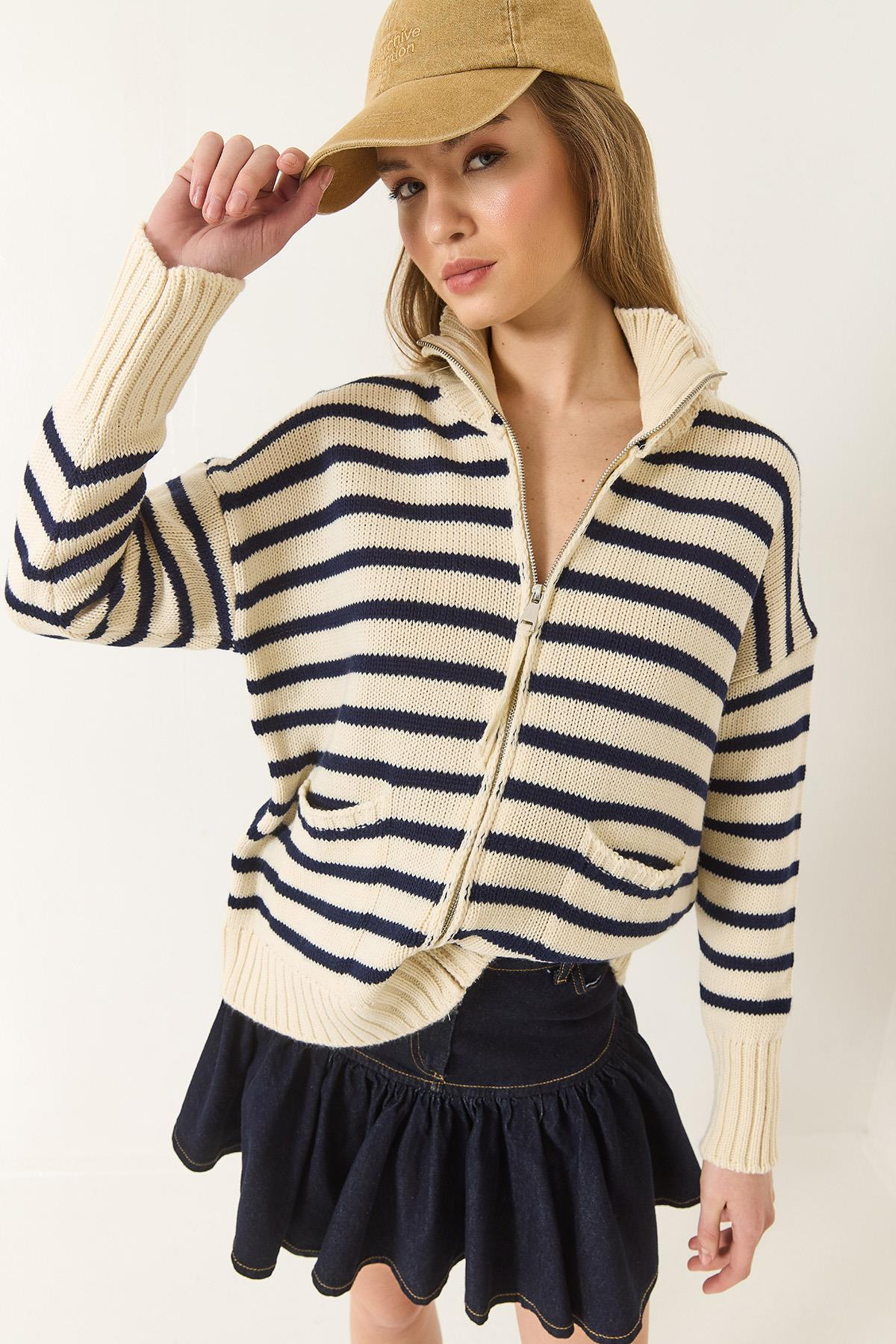 Çizgili Fermuarlı Triko Hırka 20246314 - Ekru-Lacivert HIRKA modelleri