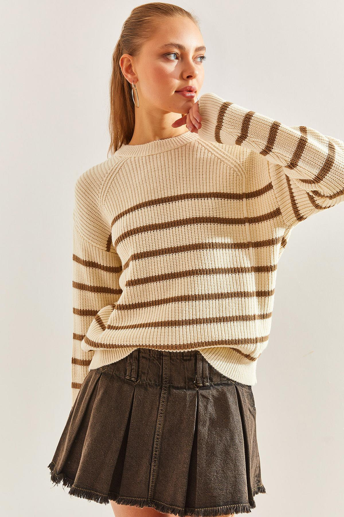 Çizgili Selanik Örgülü Triko Kazak - Krem-Camel (20234526004452)