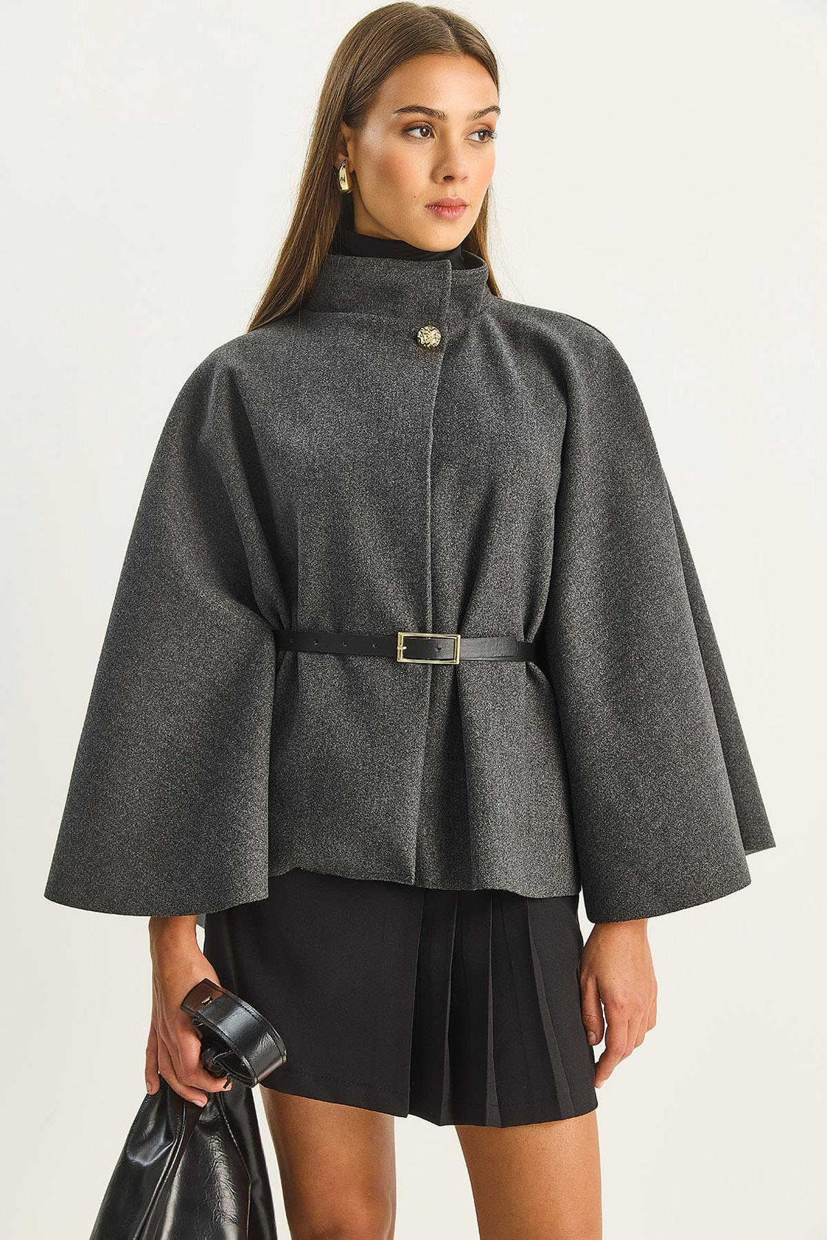 Gold Düğme Detaylı Kemerli Panço 2712  60261570 - Antrasit DIŞ GİYİM modelleri