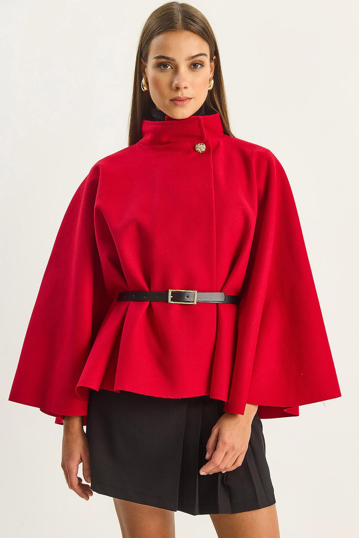 Gold Düğme Detaylı Kemerli Panço 2712  60261570 - Kırmızı DIŞ GİYİM modelleri