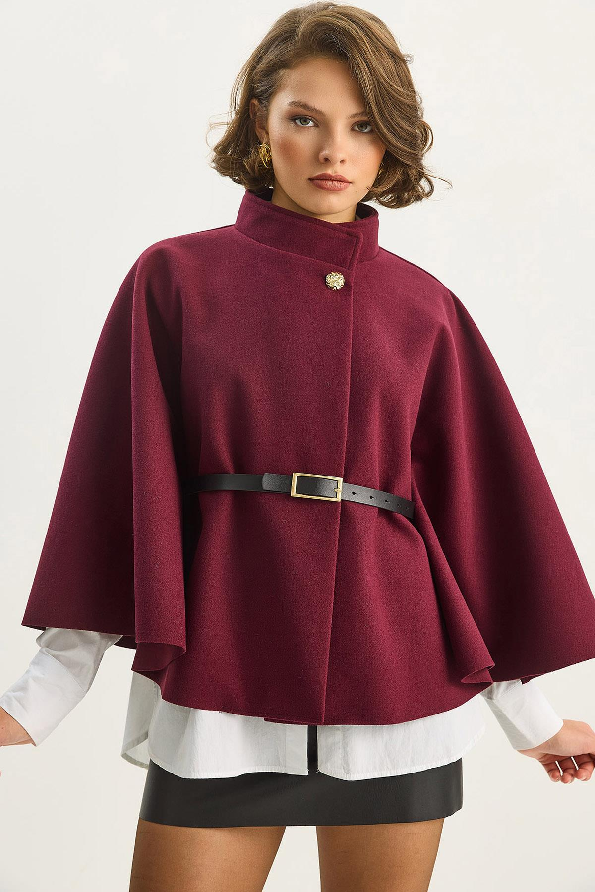 Gold Düğme Detaylı Kemerli Panço 2712  60261570 - Vişne DIŞ GİYİM modelleri