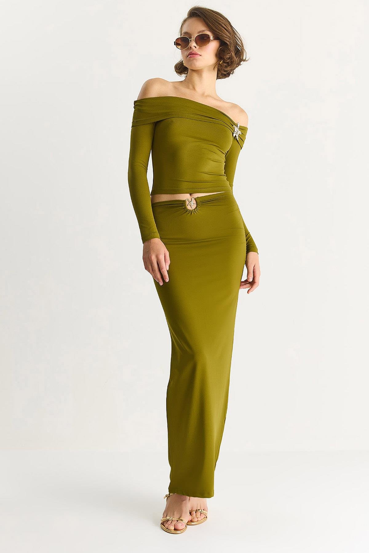 Kadın Aksesuar Detaylı Degaje Yaka Bluz Uzun Etek Likralı Saran Takım 10873 60283552 - Çağla Yeşili (60283552017)