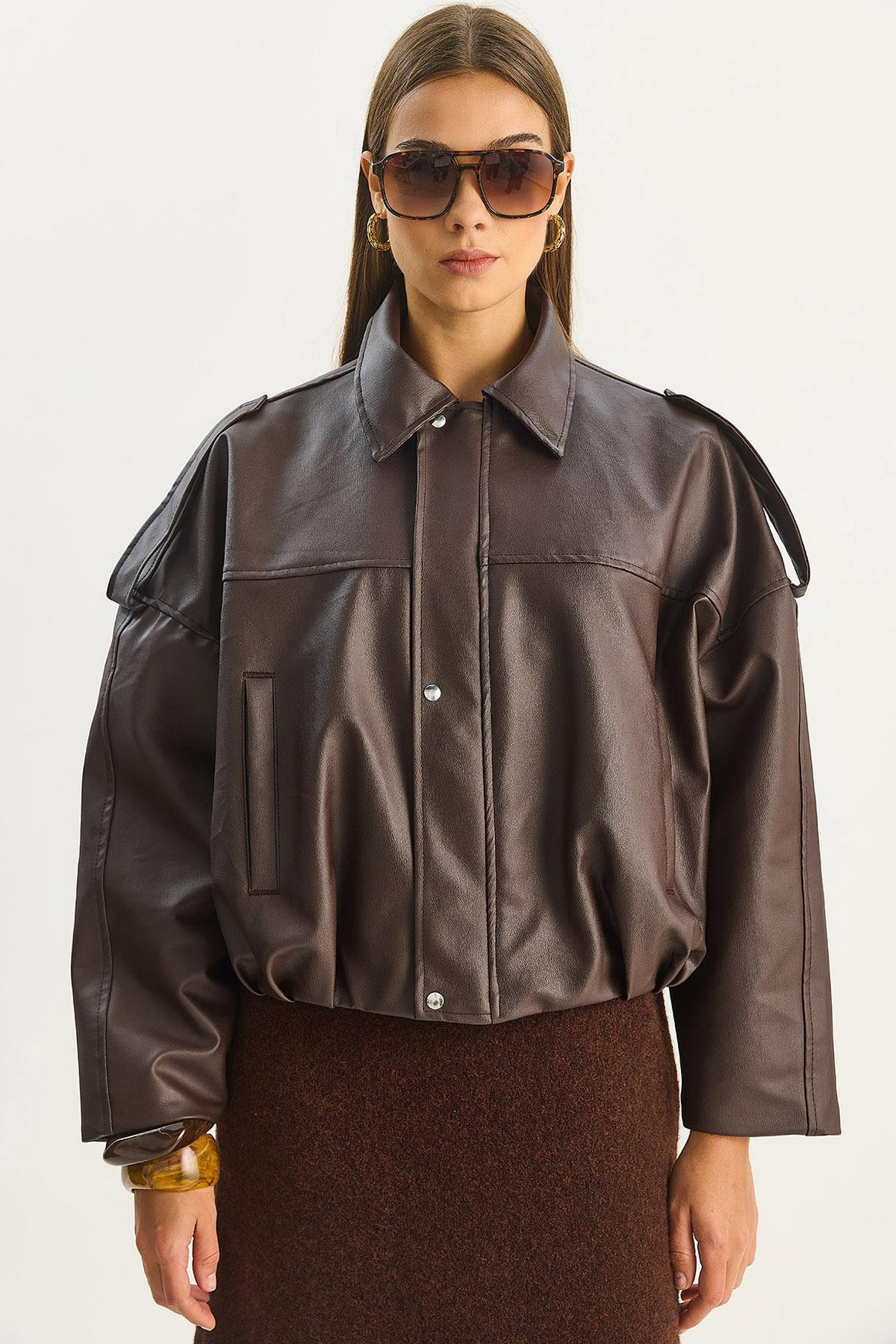 Kadın Apolet Detaylı Cepli Oversize Suni Deri Bomber Ceket 1055 60283650 - Acı Kahve (60283650008514)