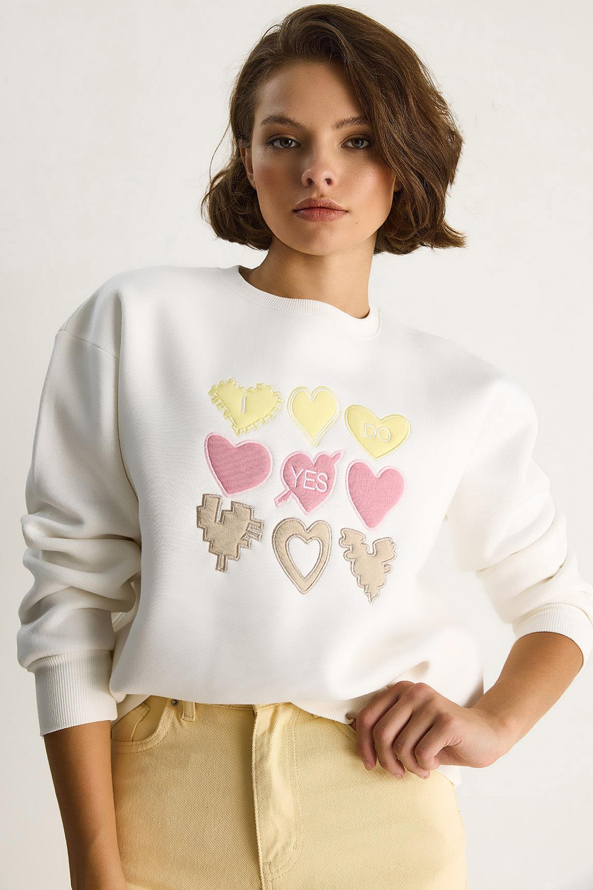 Kadın Bisiklet Yaka Kalp Nakışlı Şardonlu Üç İplik Sweatshirt 6875 60283520 - Beyaz SWEATSHİRT modelleri