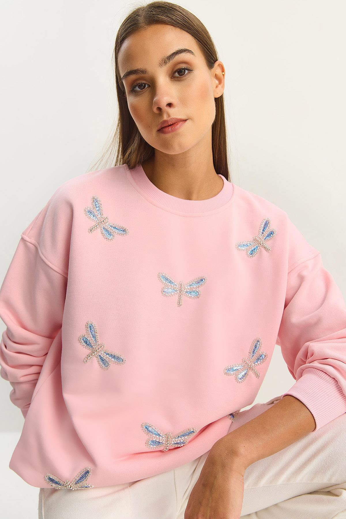 Kadın Bisiklet Yaka Kelebek Taş İşlemeli Relaxed Sweatshirt 1558 60283660 - Şeker Pembe (6028366002414)