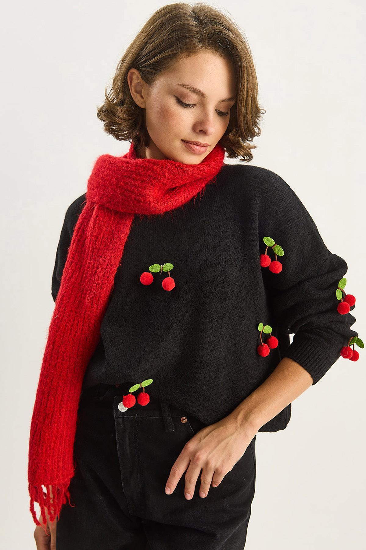 Kadın Bisiklet Yaka Kiraz Aksesuarlı Regular Triko Kazak 60283641 - Siyah (60283641002)