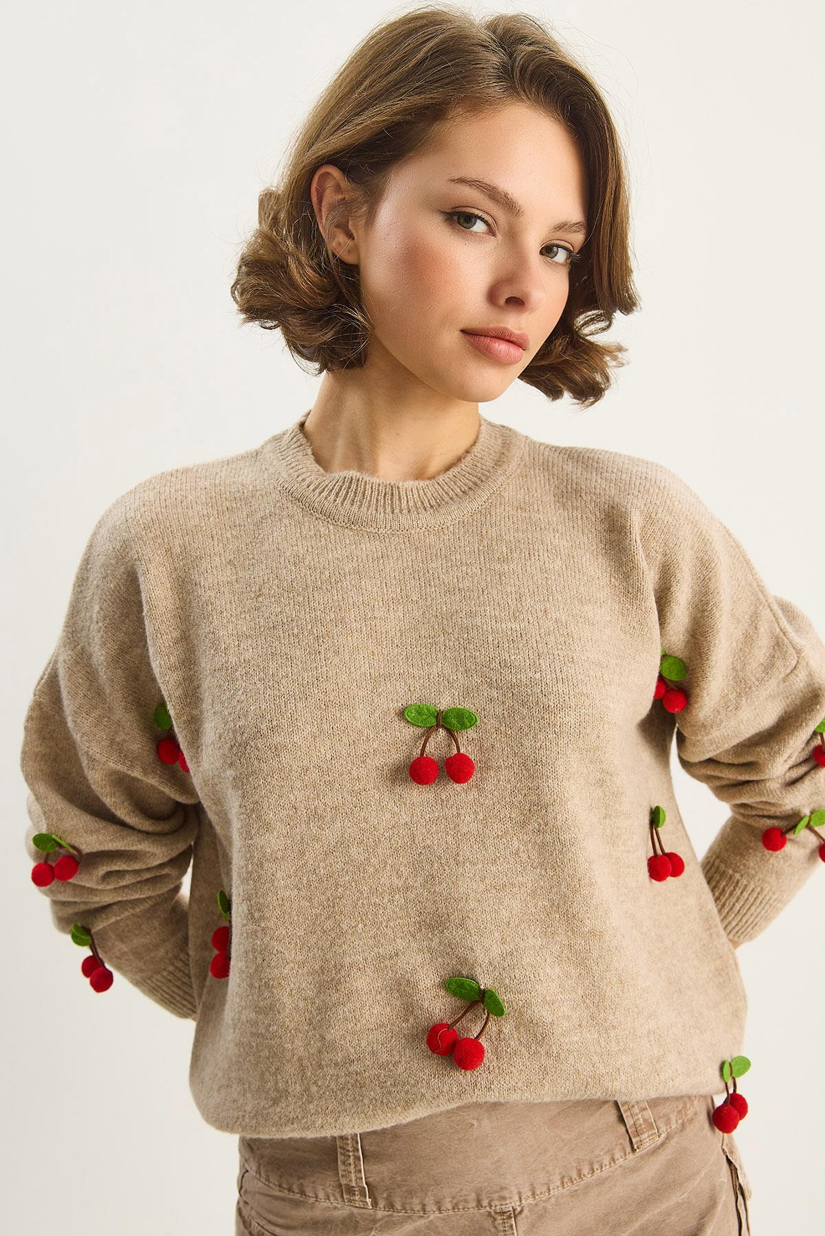 Kadın Bisiklet Yaka Kiraz Aksesuarlı Regular Triko Kazak 60283641 - Vizon (60283641069)