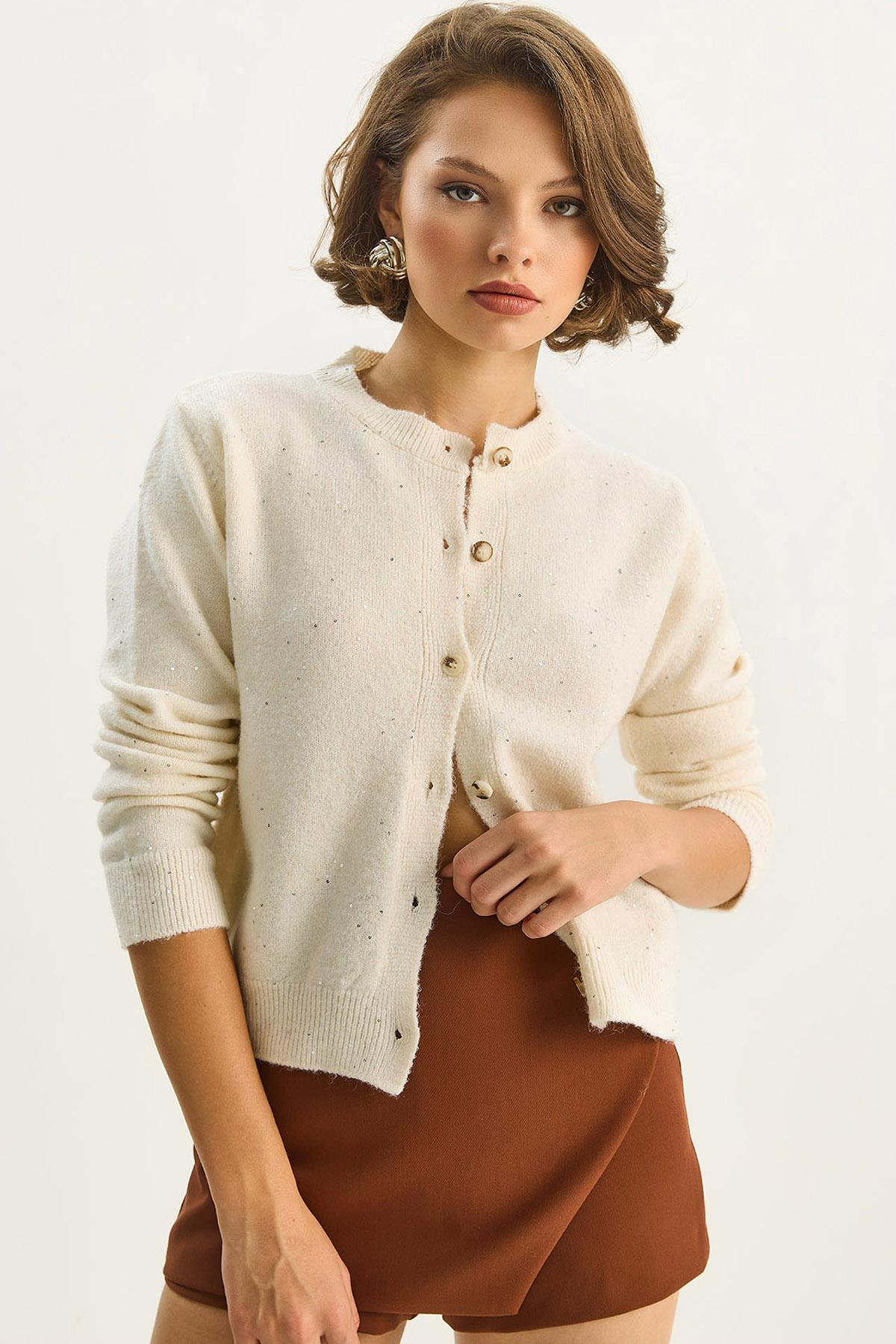 Kadın Bisiklet Yaka Pul Detaylı Yaldızlı Regular Triko Hırka 4960 60283582 - Krem (60283582039)