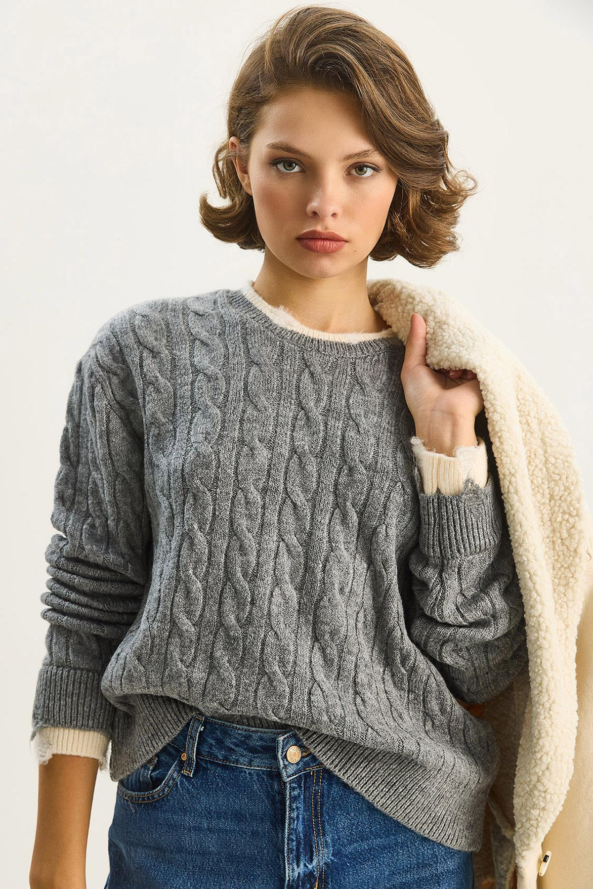 Kadın Bisiklet Yaka Saç Örgü Desenli Yırtıklı Manşet Detaylı Triko Kazak TK251087 60283599 - Gri (60283599022)
