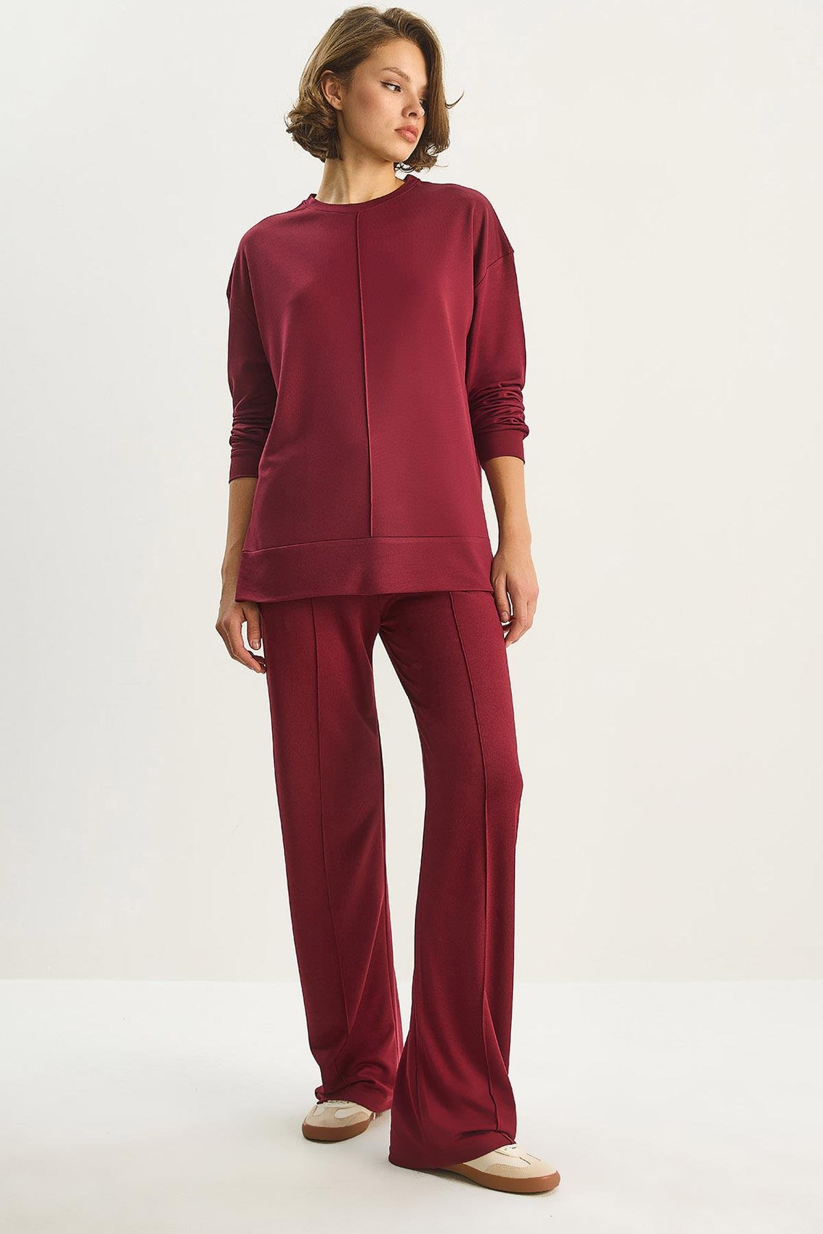 Kadın Bisiklet Yaka Uzun Kollu Üst Nervürlü Beli Lastikli Bol Pantolon Modal Takım 9401 60283624 - Bordo (60283624011)