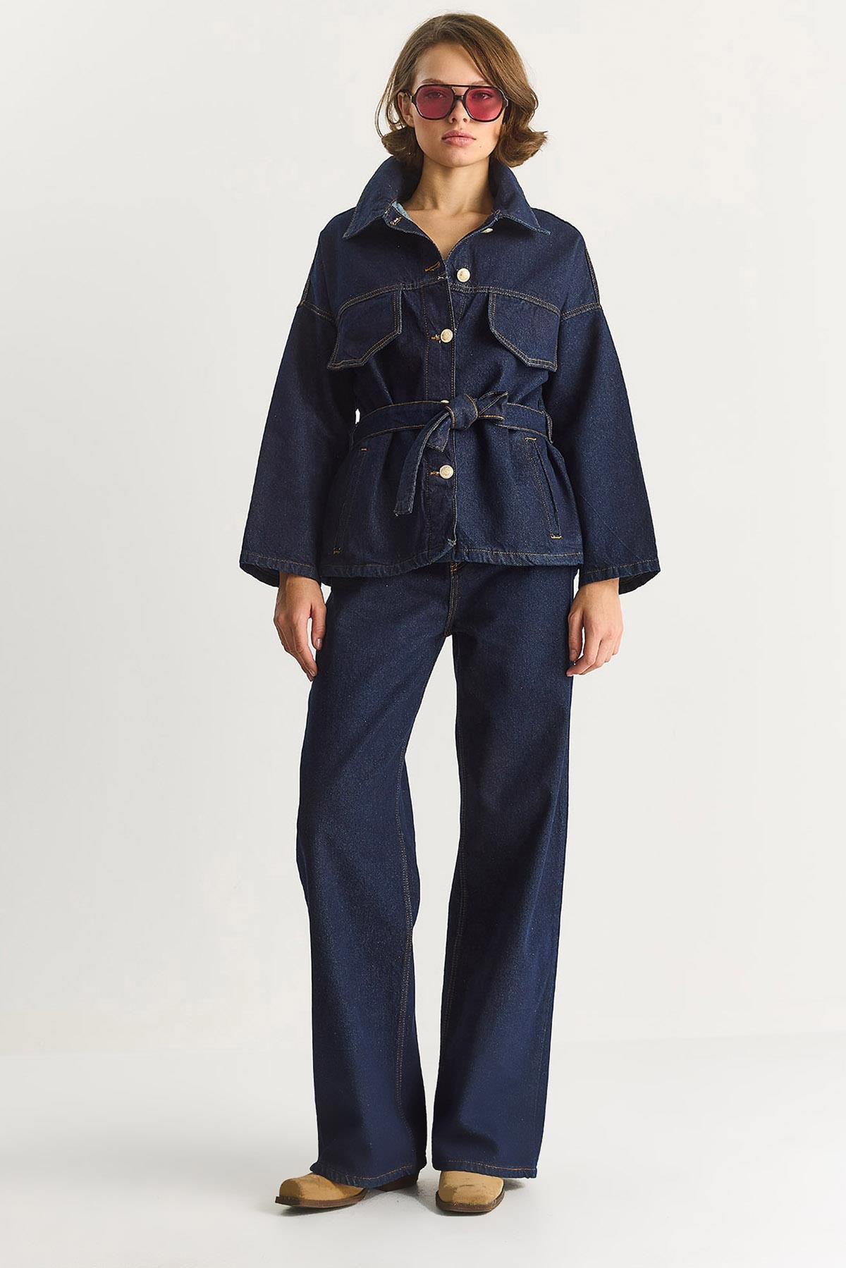 Kadın Cep Detaylı Kuşaklı Ceket Wide Leg Pantolon Premium Denim Takım 6064 60283549 - Lacivert (60283549040)