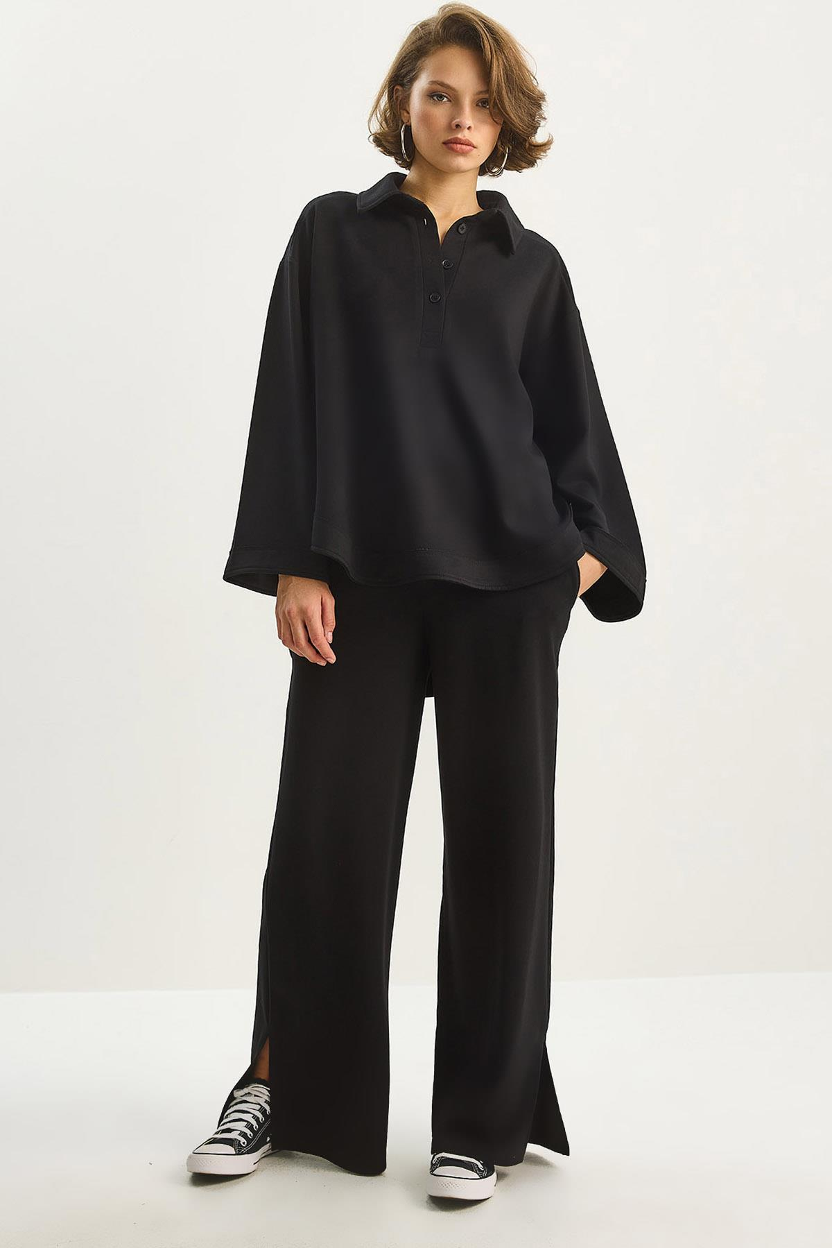 Kadın Düğme Detaylı Polo Yaka Rahat Kesim Modal Alt-Üst Takım 4036 60283607 - Siyah ALT - ÜST TAKIM modelleri
