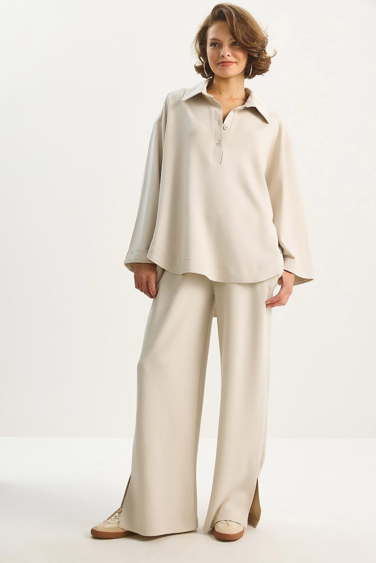Kadın Düğme Detaylı Polo Yaka Rahat Kesim Modal Alt-Üst Takım 4036 60283607 - Taş ALT - ÜST TAKIM modelleri