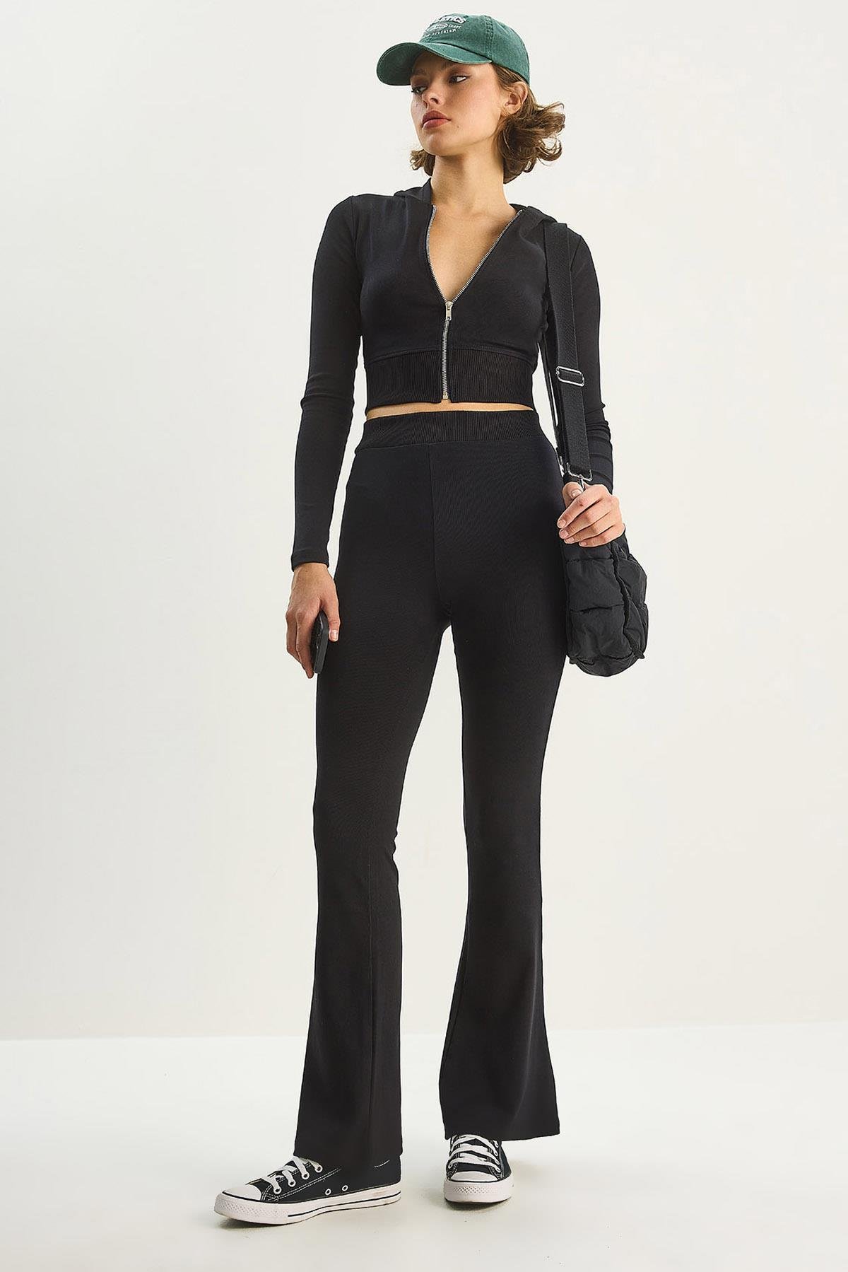 Kadın Fermuarlı Uzun Kollu Crop Üst Hafif İspanyol Paça Tayt 2180 60283622 - Siyah (60283622002)
