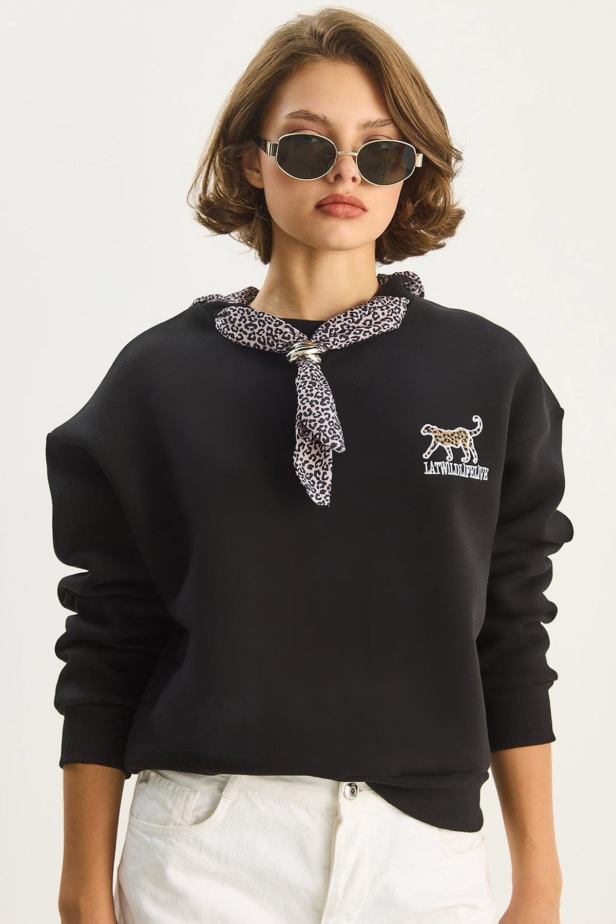 Kadın Fular Detaylı Leopar Nakışlı Üç İplik Şardonlu Oversize Sweatshirt 6917 60283616 - Siyah (60283616002)