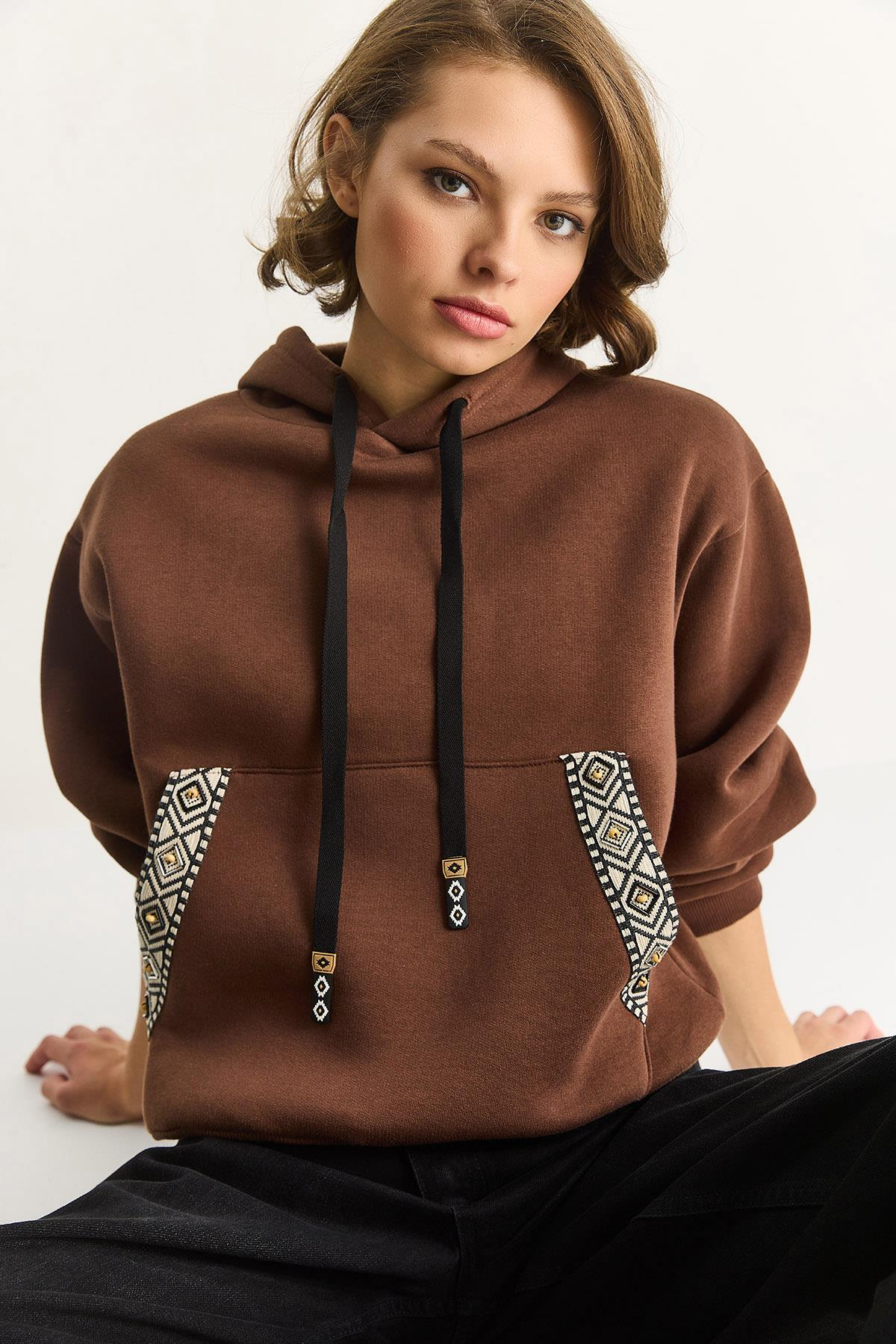 Kadın Kapüşonlu Etnik Şerit Detaylı Kanguru Cepli Şardonlu Sweatshirt 6871 60283557 - Kahverengi (60283557031)