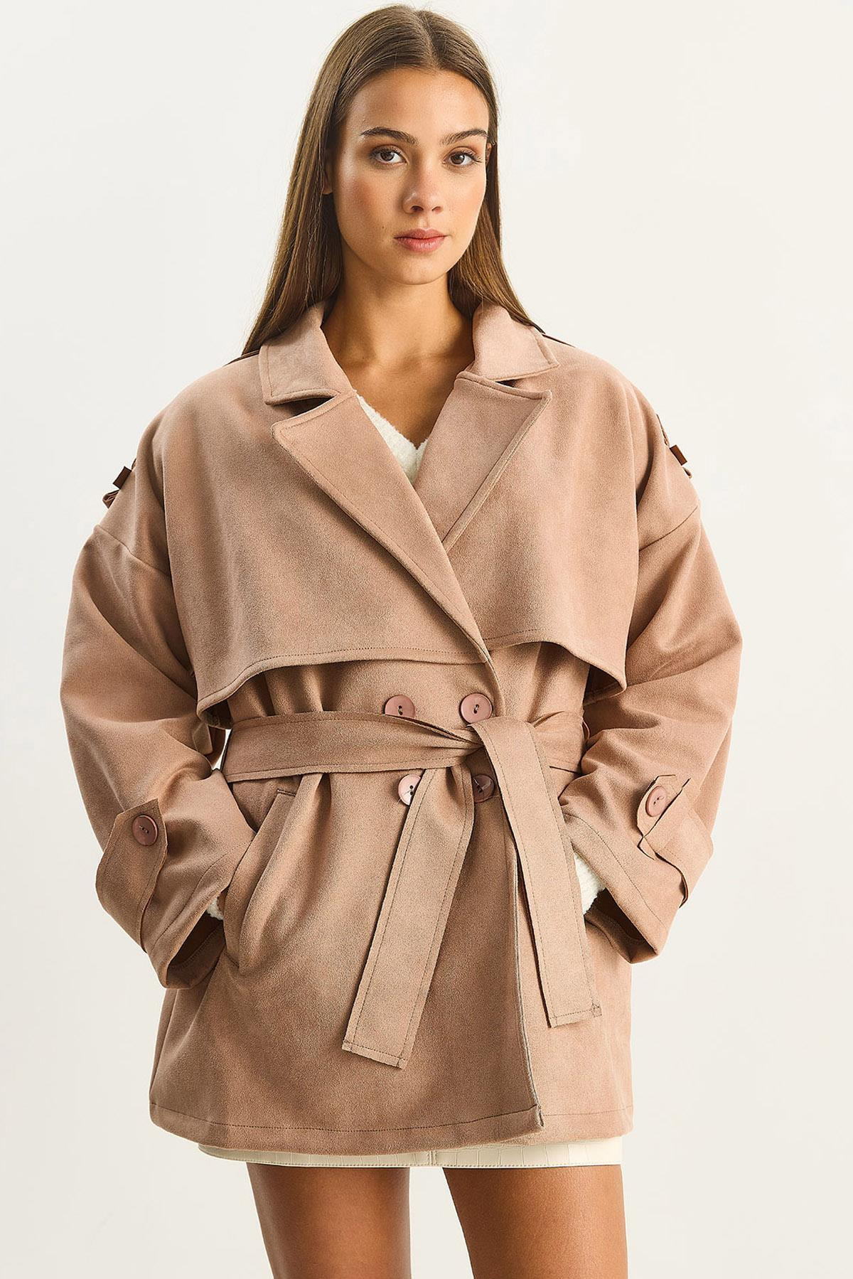 Kadın Kruaze Yaka Aller Detaylı Apoletli Kuşaklı Cepli Süet Trençkot 99007 60283661 - Soft Pudra DIŞ GİYİM modelleri