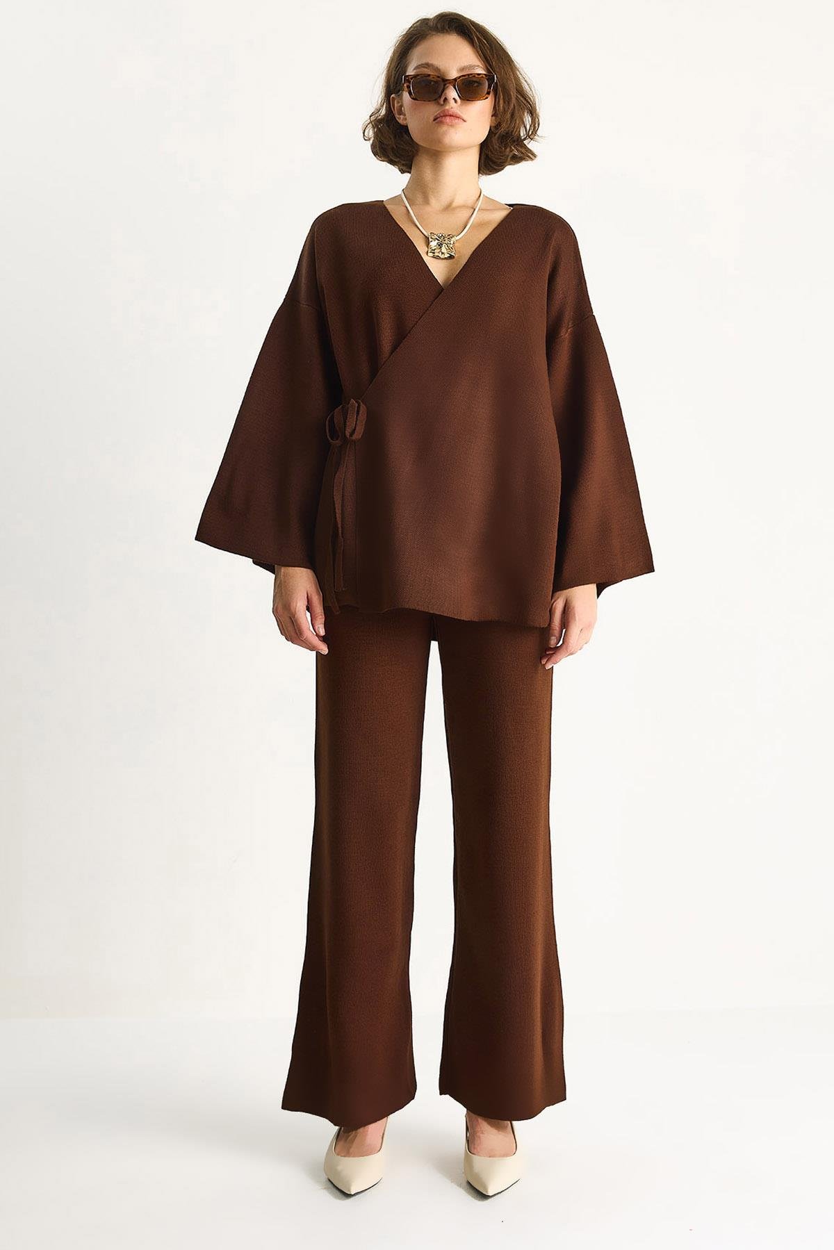 Kadın Kruvaze Triko Bluz & Yüksek Bel Pantolon Takım N7206 60283545 - Acı Kahve (60283545008514)