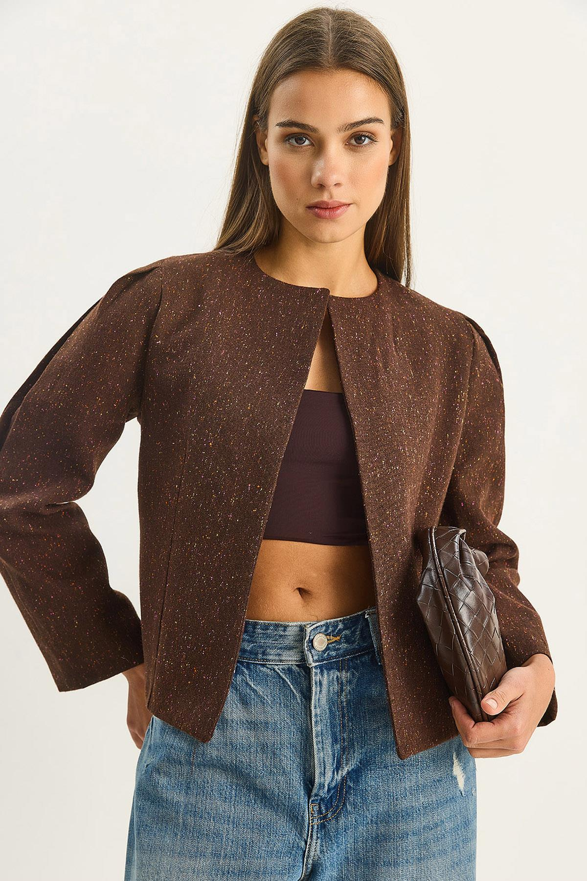 Kadın O Yaka Önü Açık Kendinden Dokulu Astarlı Ceket 0488 60283670 - Kahverengi CEKET modelleri