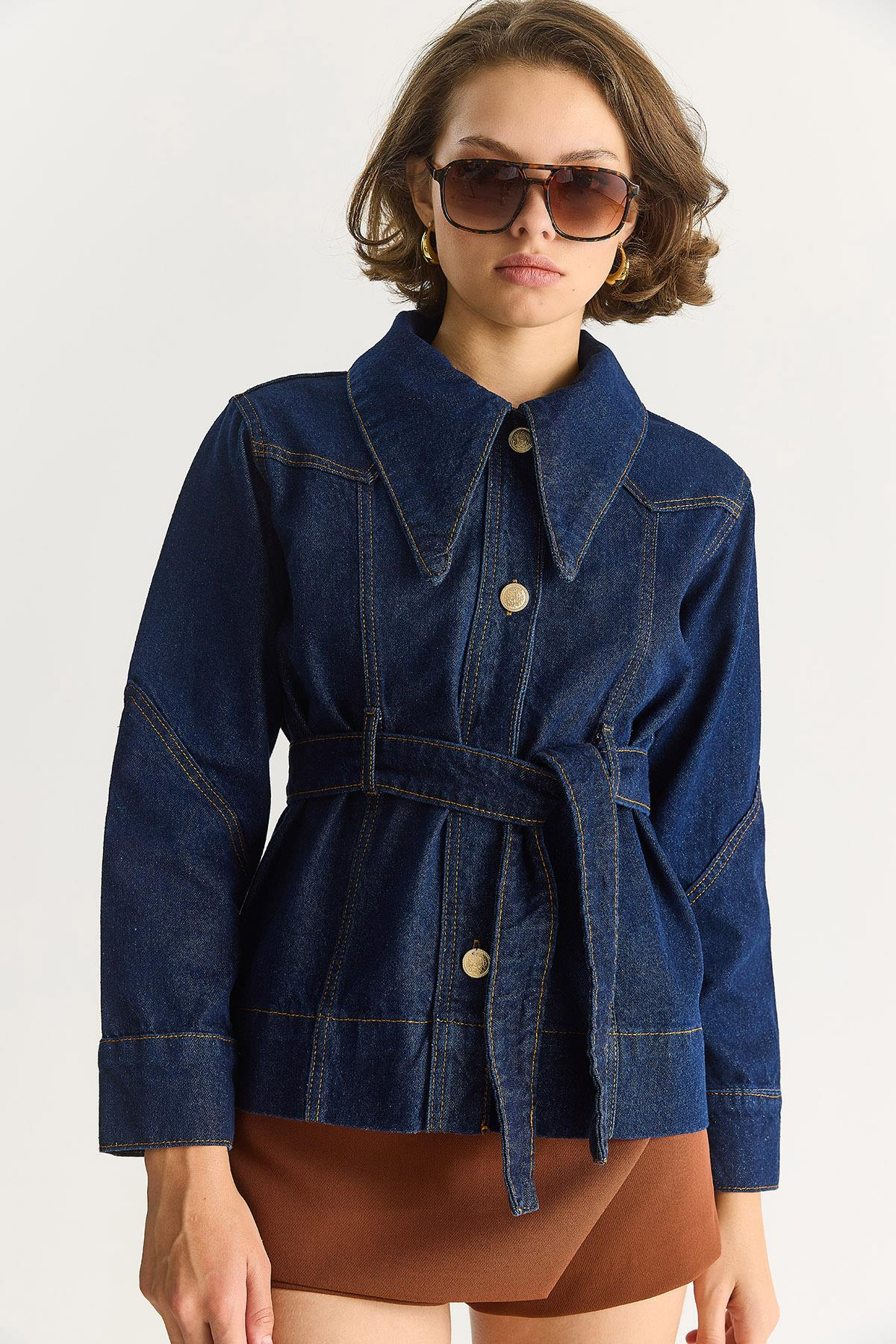 Kadın Sivri Yaka Kuşaklı Dikiş Detaylı Denim Ceket 5253 60283533 - Lacivert CEKET modelleri