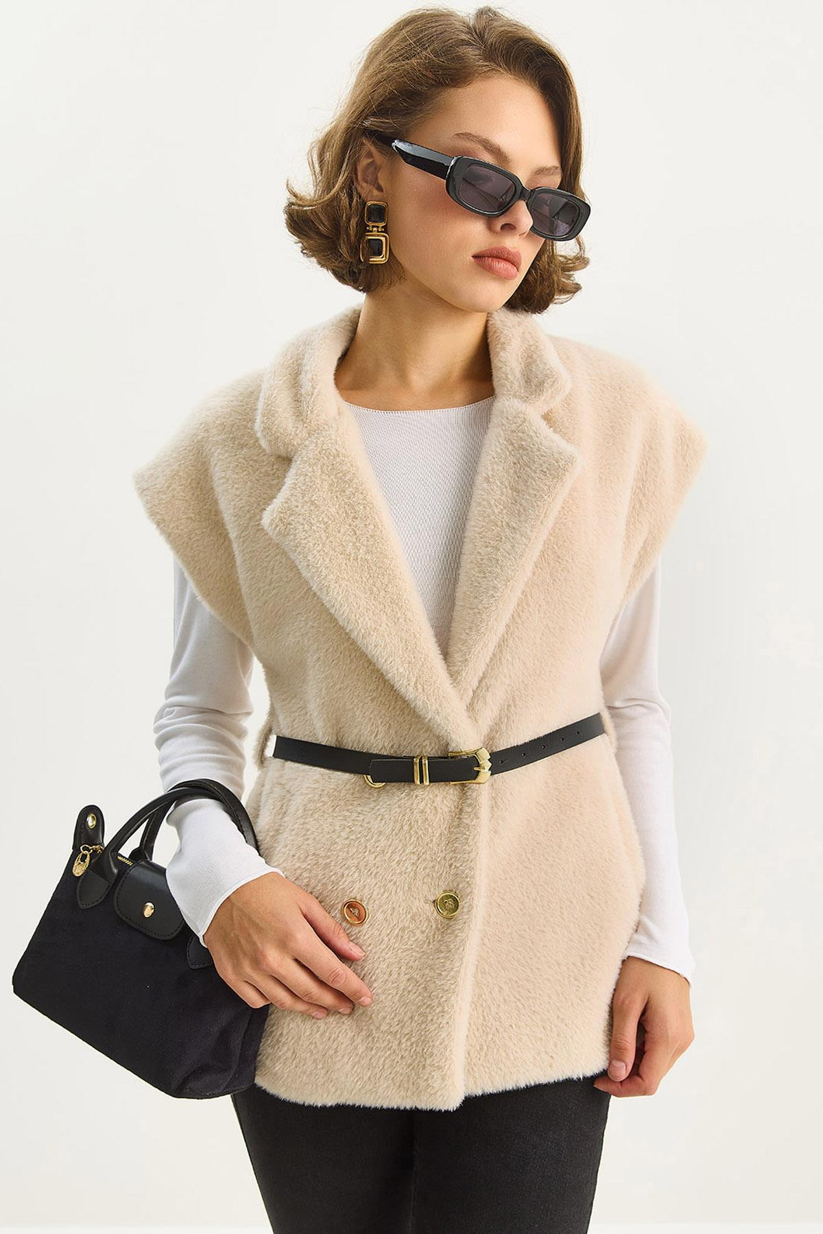 Kadın Suni Kürk Dokulu Kemerli Cep Detaylı Astarlı Yelek 11162 60283598 - Bej (60283598FF5)