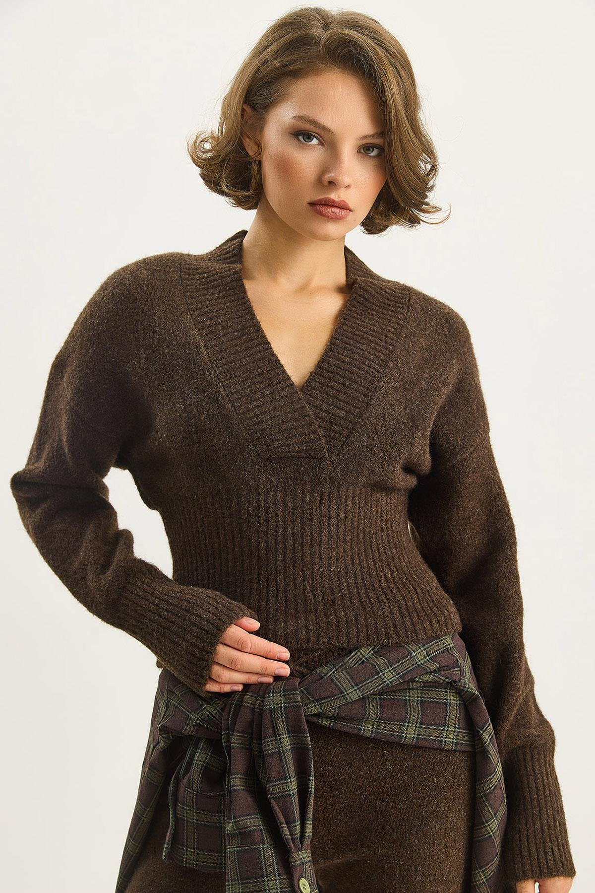 Kadın V Yaka Bel Oturtmalı Fitilli Triko Kazak 5080 60283586 - Acı Kahve (60283586008514)