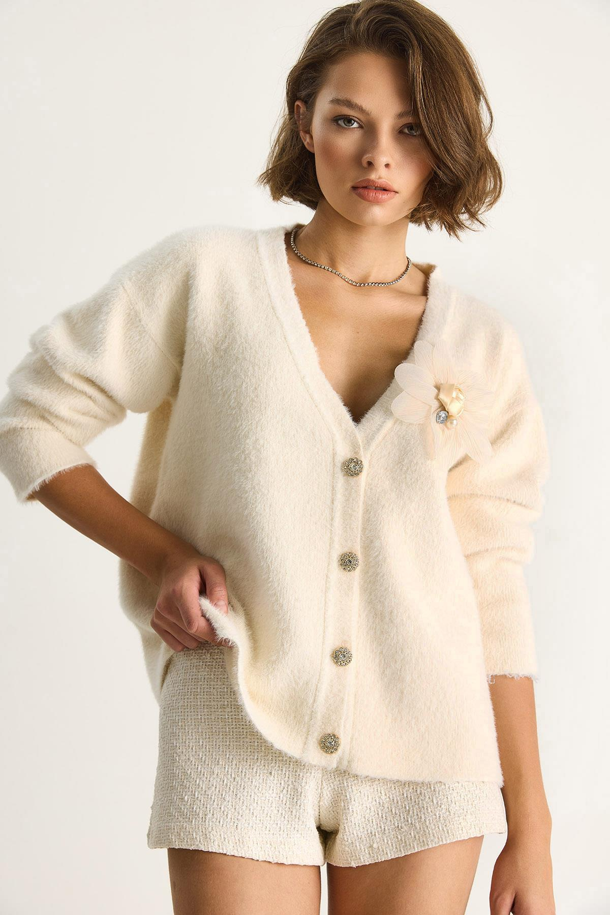 Kadın V Yaka Düğmeli Çiçek Aksesuarlı Yumuşak Dokulu Hırka 25301 60284081 - Ekru HIRKA modelleri