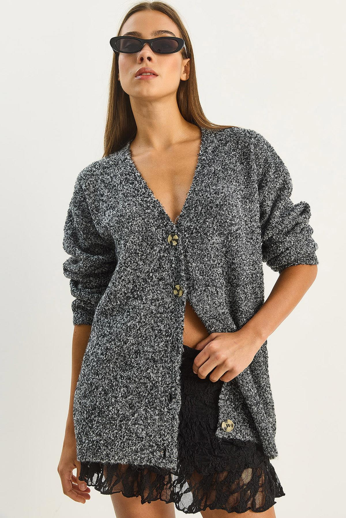 Kadın V Yaka Oversize Buklet Carmen Triko Hırka 2433 60283679 - Siyah (60283679002)