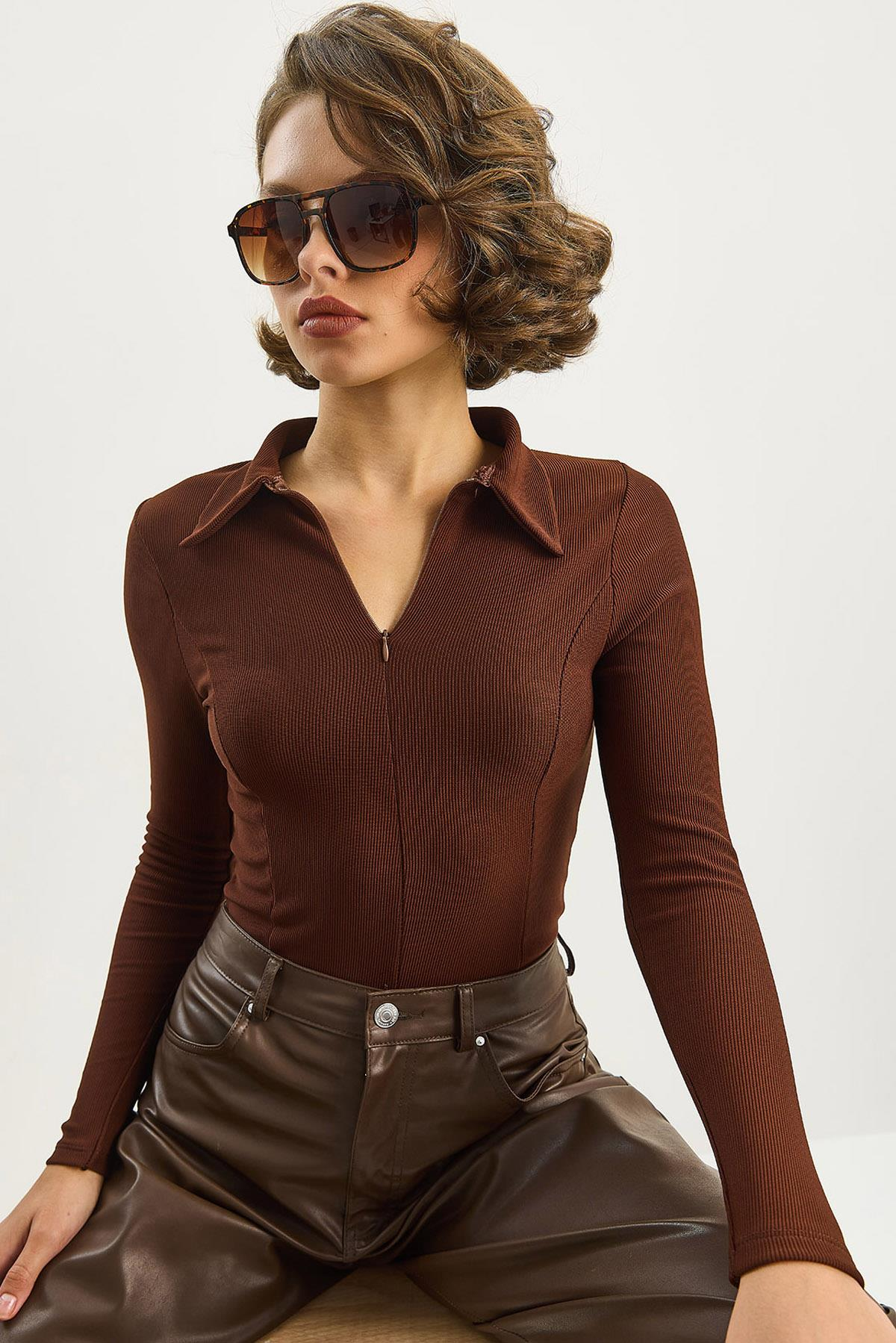 Kadın Vücudu Saran Yarım Fermuarlı Fitilli Likralı Polo Yaka Basic Bluz 8073 60283602 - Acı Kahve BLUZ modelleri