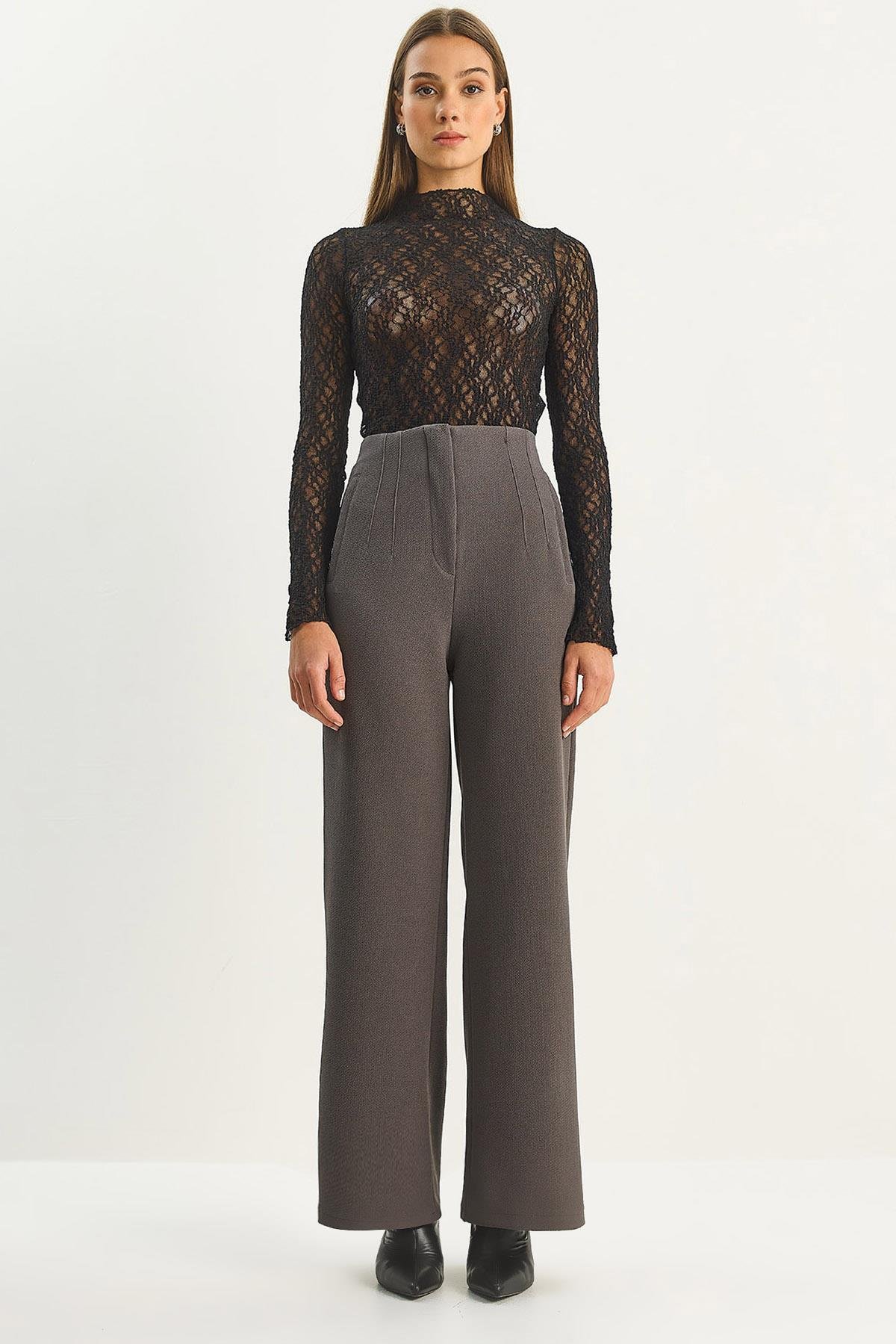 Kadın Yüksek Bel Fileto Detaylı Cepli Bol Paça Pantolon 1003 60283580 - Antrasit PANTOLON modelleri