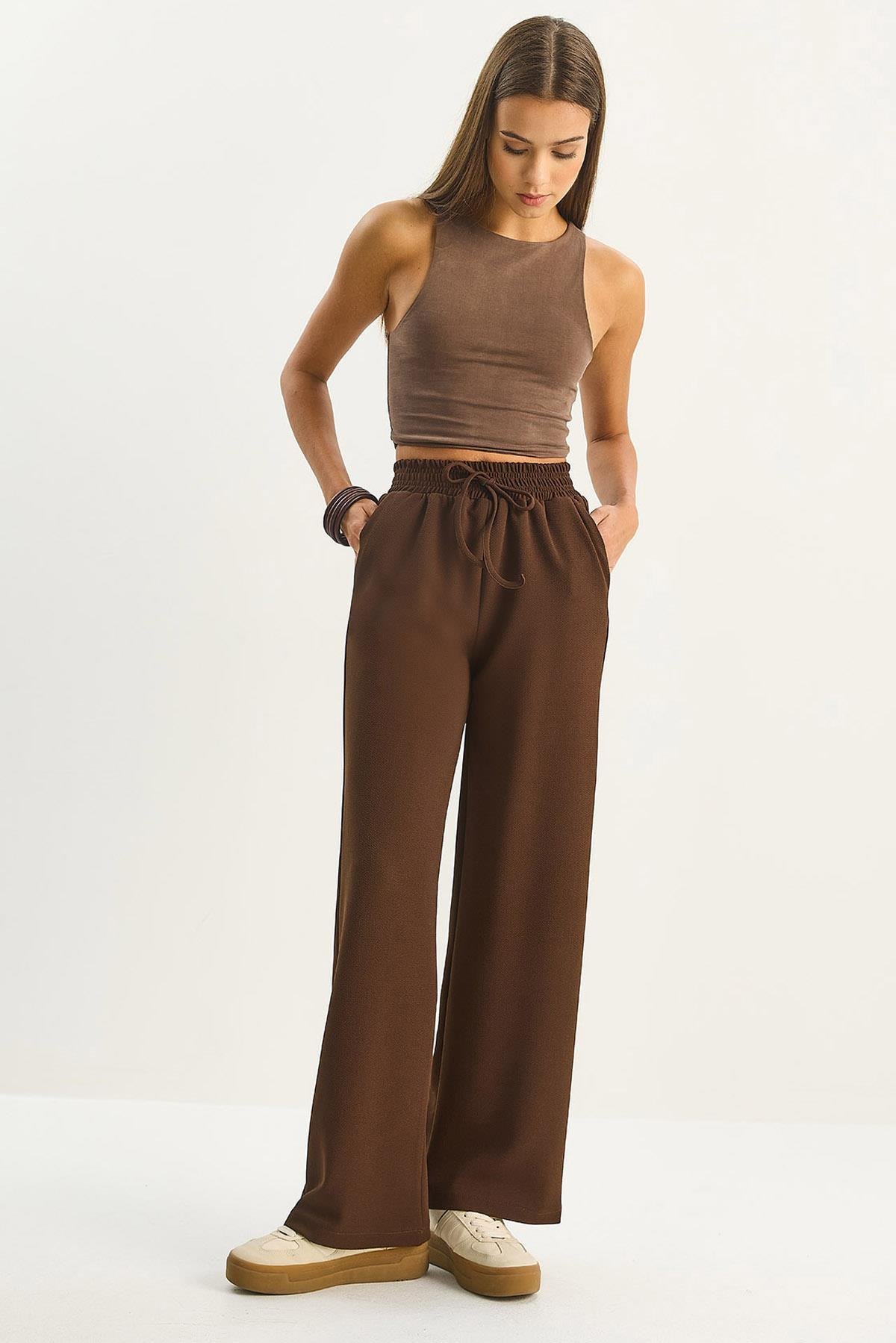 Kadın Yüksek Bel Lastikli Bağcıklı Dökümlü Bol Paça Pantolon 1006 60283579 - Acı Kahve (60283579008514)