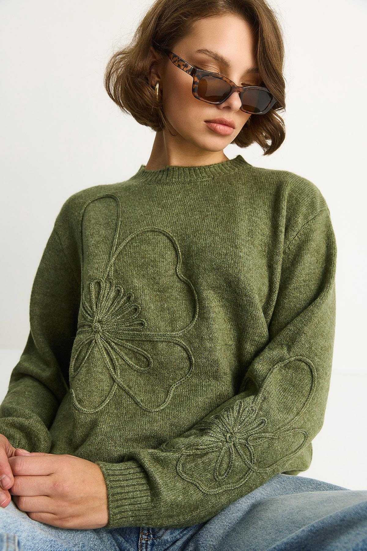 Kadın Yumuşak Dokulu Çiçek Desen İşlmeli Triko Kazak 251085  60284089 - Yeşil KAZAK modelleri