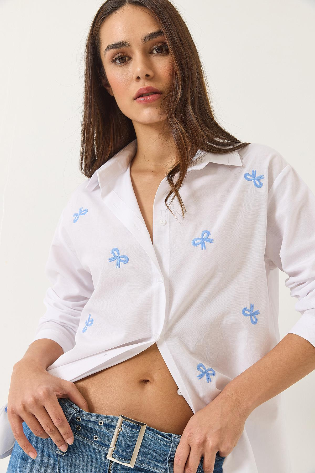 Kurdele Nakışlı Uzun Kollu Regular Gömlek 60284027 - Beyaz