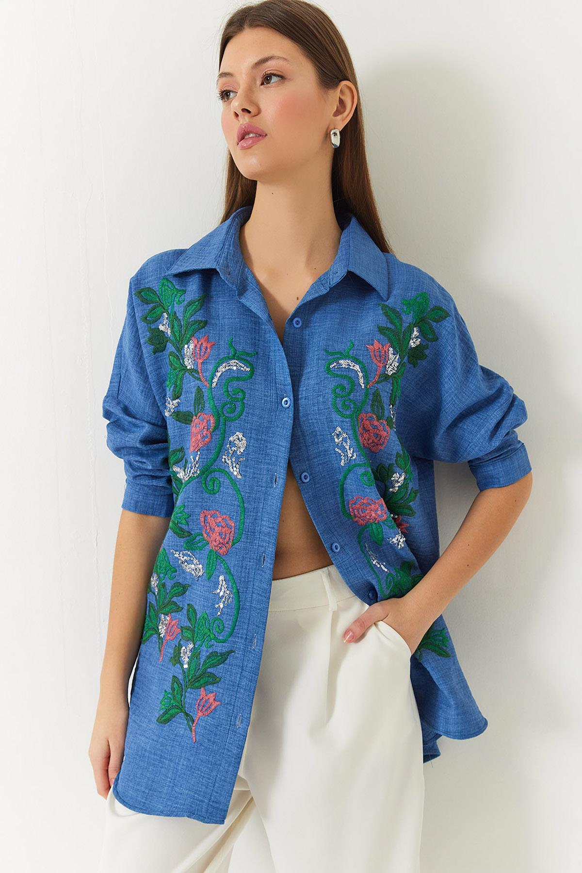 Nakışlı Sofya Keten Gömlek 60181014 - Mavi GÖMLEK modelleri
