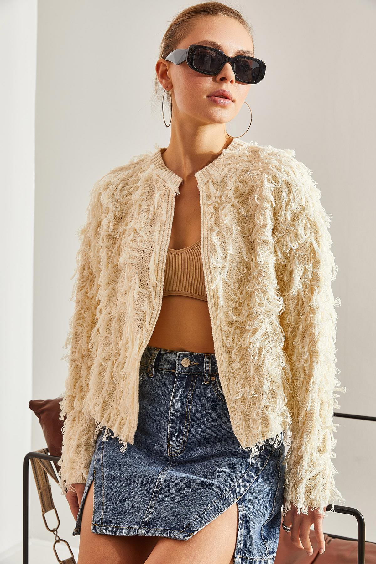 Püsküllü Triko Hırka - Krem HIRKA modelleri