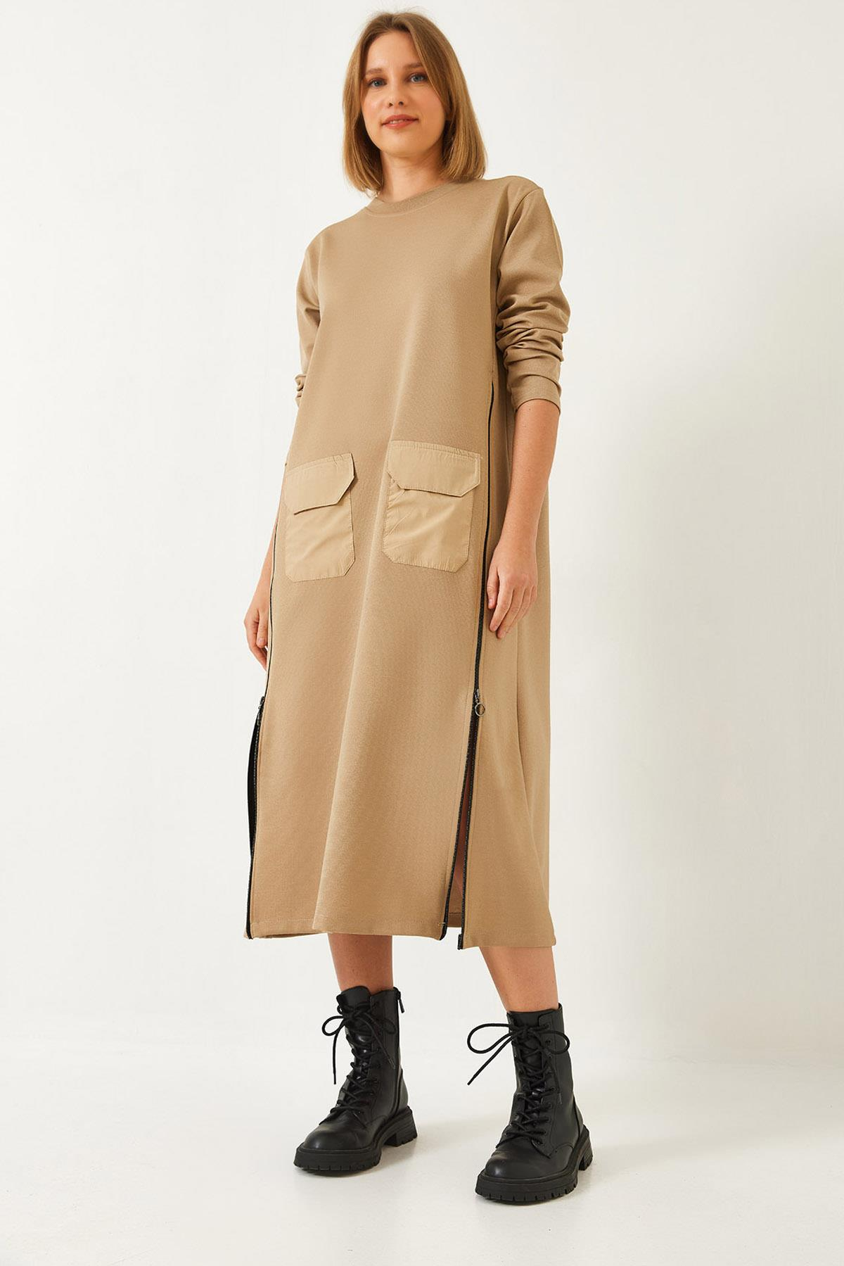 Yanları Fermuarlı Çift Cepli Uzun Elbise 8004 60351340 - Bej